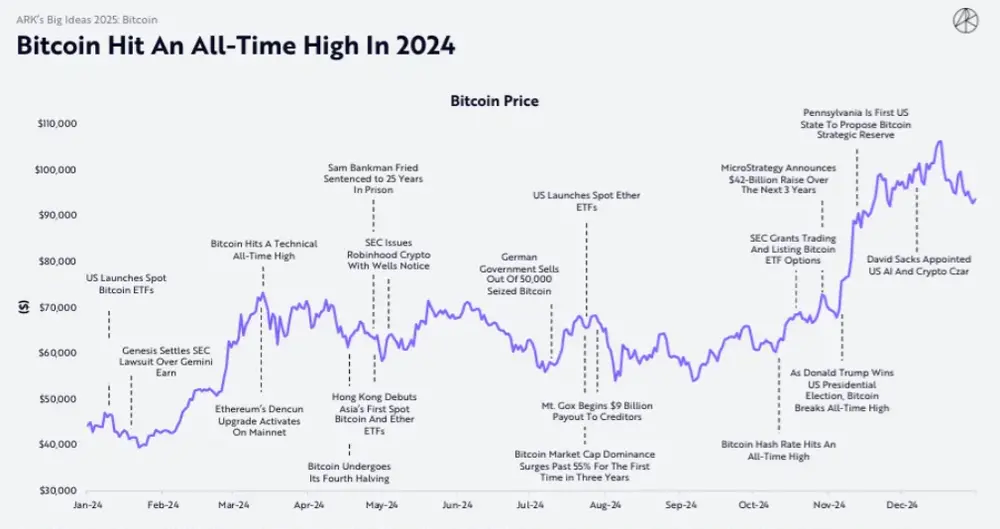 现货ETF获批、机构持仓占比超过 5%以及减半周期形成共振,此三重因素推动比特币朝着 ARK 所预测的 2030 年目标价格稳步迈进。