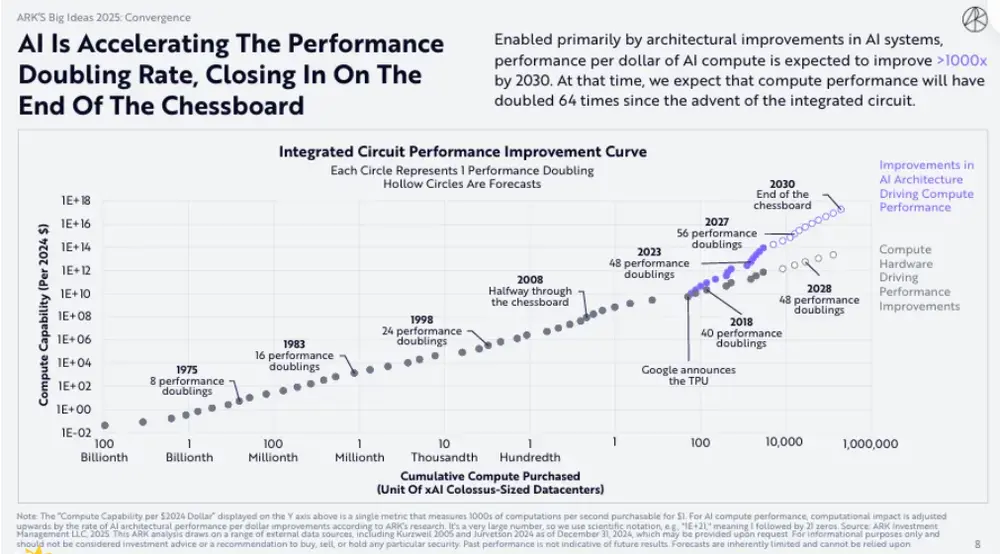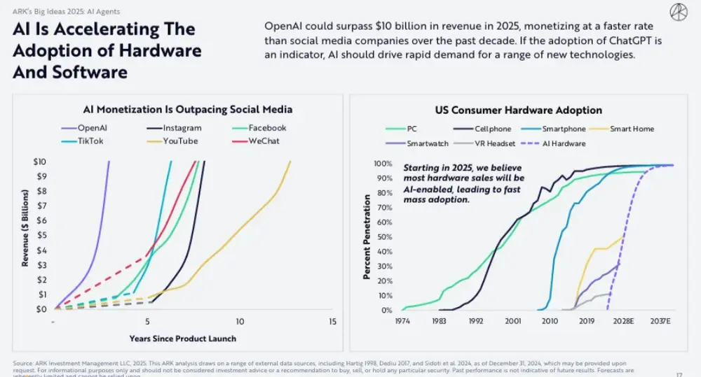 木头姐的ARK基金《Big Ideas 2025》报告指出,AI Agent、机器人技术、能源存储、公共区块链以及多组学测序五大技术平台,正加速走向融合,且将推动全球经济迈入指数级增长的轨道。